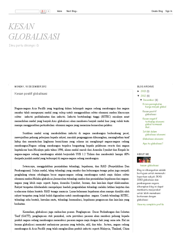 Antara kesan buruk laman web sosial Kesan negatif terhadap ekonomi global termasuk malaysia krisis yang terjadi di as memberi kesan yang secara terus kepada malaysia. 1) meningkatkan aliran perdagangan • aliran perdagangan antara negara akan menyebabkan ekonomi negara meningkat •. Apakah impikasi serta kesan globalisasi terhadap : Dari sudut positif, globalisasi ekonomi dapat menaik taraf ekonomi negara, meningkatkan taraf hidup rakyat, mencipta pembangunan negara dan memberi peluang kepada pekerja mahir untuk meningkatkan sumber pendapatan di negara lain. Kesan globalisasi ekonomi terhadap sesebuah negara 1. Kesan globalisasi ekonomi terhadap sesebuah negara 2. Perubahan era globalisasi 15 2.5. Kegawatan ekonomi ini berlaku apabila aliran masuk modal antarabangsa yang begitu besar ke dalam negara serantau asia pasifik atau negara sedang membangun akan menyebabkan kewangan negara serantau tersebut menjadi lebih mudah berubah. Proses globalisasi dan hegemoni barat. Budaya tempatan yang murni akhirnya dikikis oleh globalisasi. Peniaga dapat meluaskan pasatan ke seluruh dunia. Terdapat banyak kajian berhubung pengaruh globalisasi yang memberi kesan terhadap produktiviti buruh mahupun produktiviti faktor keseluruhan (tfp).