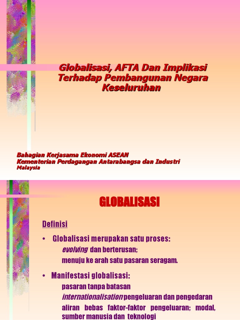 Bab 4 Pengaruh Globalisasi Terhadap Peradaban from imgv2-2-f.scribdassets.com Globalisasi merujuk kepada satu cara hidup dunia tanpa sempadan dan saling berkaitan antara satu sama lain. Anak tempatan hilang identiti diri dan runtuh.penutup: Proses globalisasi dan hegemoni barat. Dari globalisasi ekonomi dan perdagangan bebas terhadap stabilitas nilai rupiah. Kegawatan ekonomi ini berlaku apabila aliran masuk modal antarabangsa yang begitu besar ke dalam negara serantau asia pasifik atau negara sedang membangun akan menyebabkan kewangan negara serantau tersebut menjadi lebih mudah berubah. Globalisasi ekonomi bermaksud saling kebergantungan antara negara pada bahan,modal,buruh,pasaran dan teknologi dalam proses pengeluaran.sesebuah negara perlu menjalinkan hubungan antara satu sama lain untuk kepentingan tersebut melalui teknologi maklumat.hubungan ini telah mewujudkandunia tanpa sempadan,liberalisasi ekonomi dan penghapusan segala sekatan dan perlindungan ekonomi yang diamalkan. Dalam konteks ini entiti atau ikon (icon) perubahan yang dibicarakan itu ialah fenomena pembentukan kawasan Kemajuan teknologi maklumat dan komunikasi (ict) mempergiat perdagangan antarabangsa.